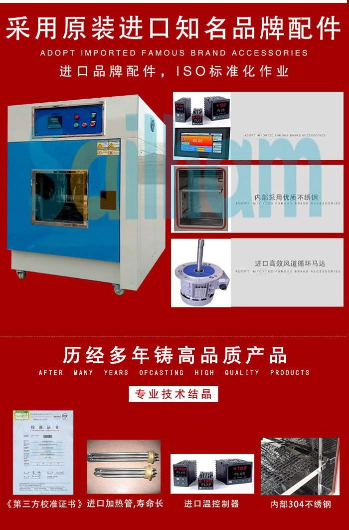 4、采用耐高溫、噪音小、振動小電機,同時應用渦輪型風輪,風壓強風量大,有效的使箱內熱風循環(huán)流暢,使溫度均勻性高。
